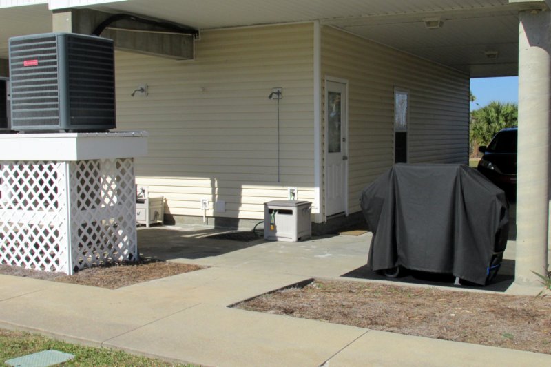Courtyard view of carport, Primary bedroom screened porch, and living area screened porch